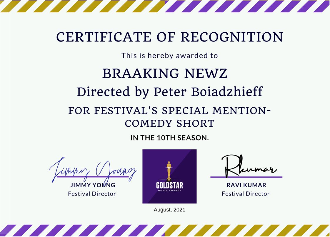 We received a festival special mention by Gold Star Movie Awards, August 2021, Newark.